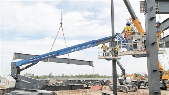 在十二师五一农场高达科技跨境电商航空物流园项目建设现场,施工人员进行钢结构吊装作业(资料图片)。兵团日报常驻记者 田园 摄