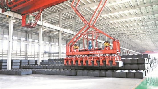 在阿拉尔市南疆碳素新材料有限公司,工人操作天车码放预焙阳极生料块(资料图片)。兵团日报常驻记者 林国强 摄