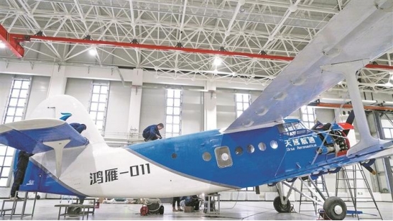 在天域航通大型无人机和通航飞机生产基地,一台国产鸿雁(HY100)大型无人机整装待发(资料图片)。兵团日报全媒体记者 陈洋 摄