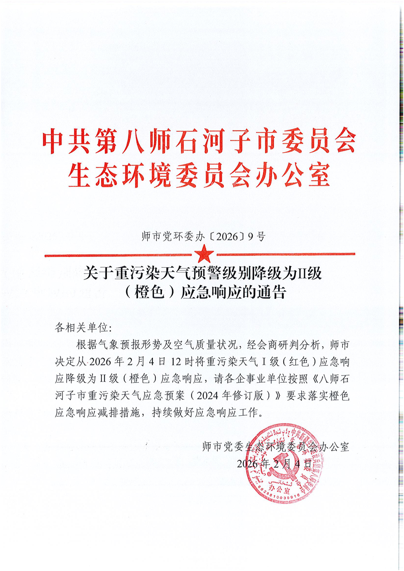 师市党环委办〔2026〕9号关于重污染天气预警级别降级为Ⅱ级(橙色)应急响应的通告