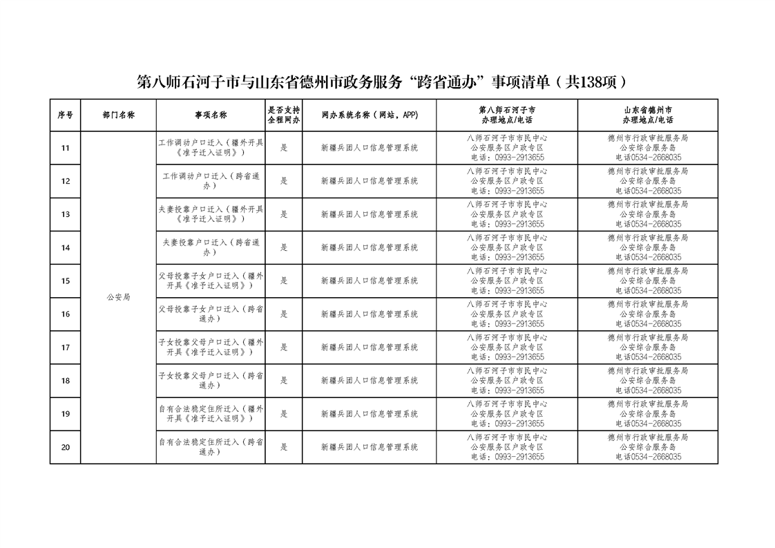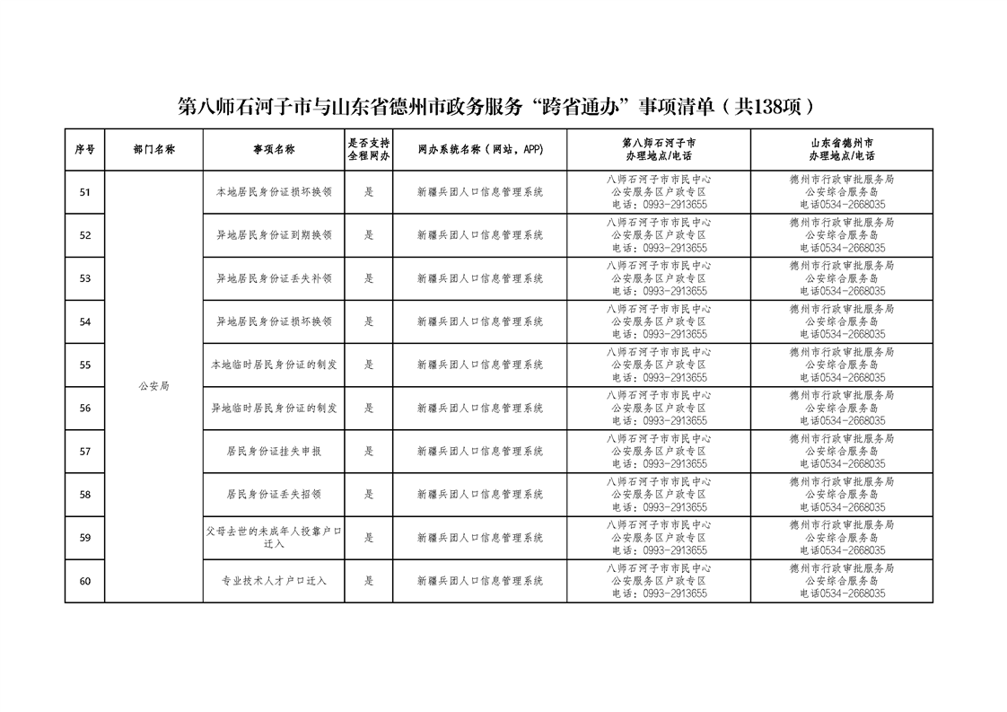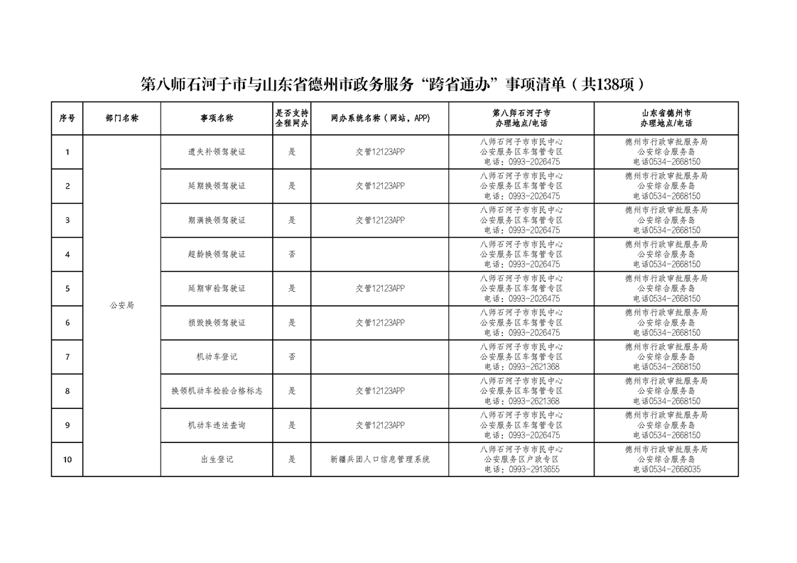 八师石河子市与山东省德州市“跨省通办”事项清单(共138项)
