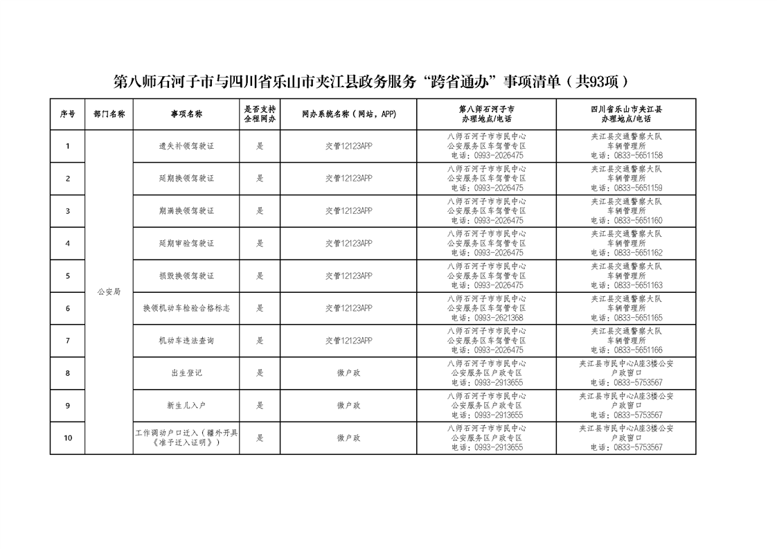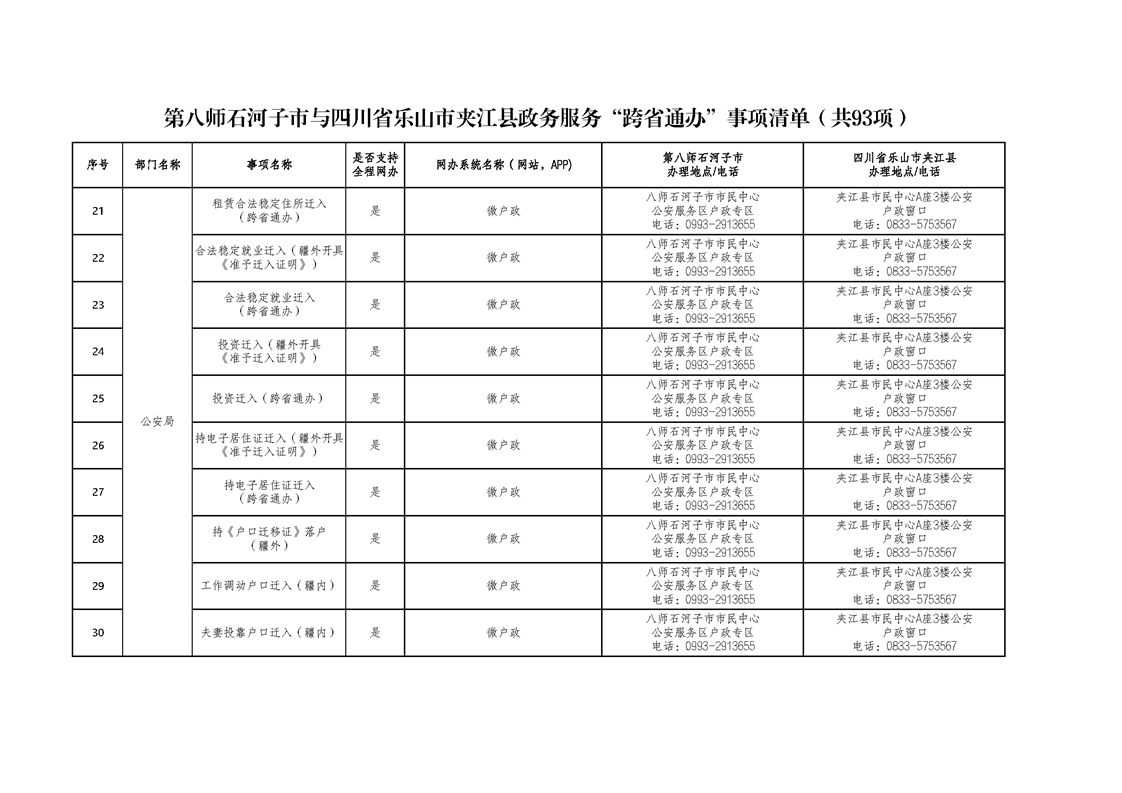 八师石河子市与四川省乐山市夹江县“跨省通办”事项清单(共93项)
