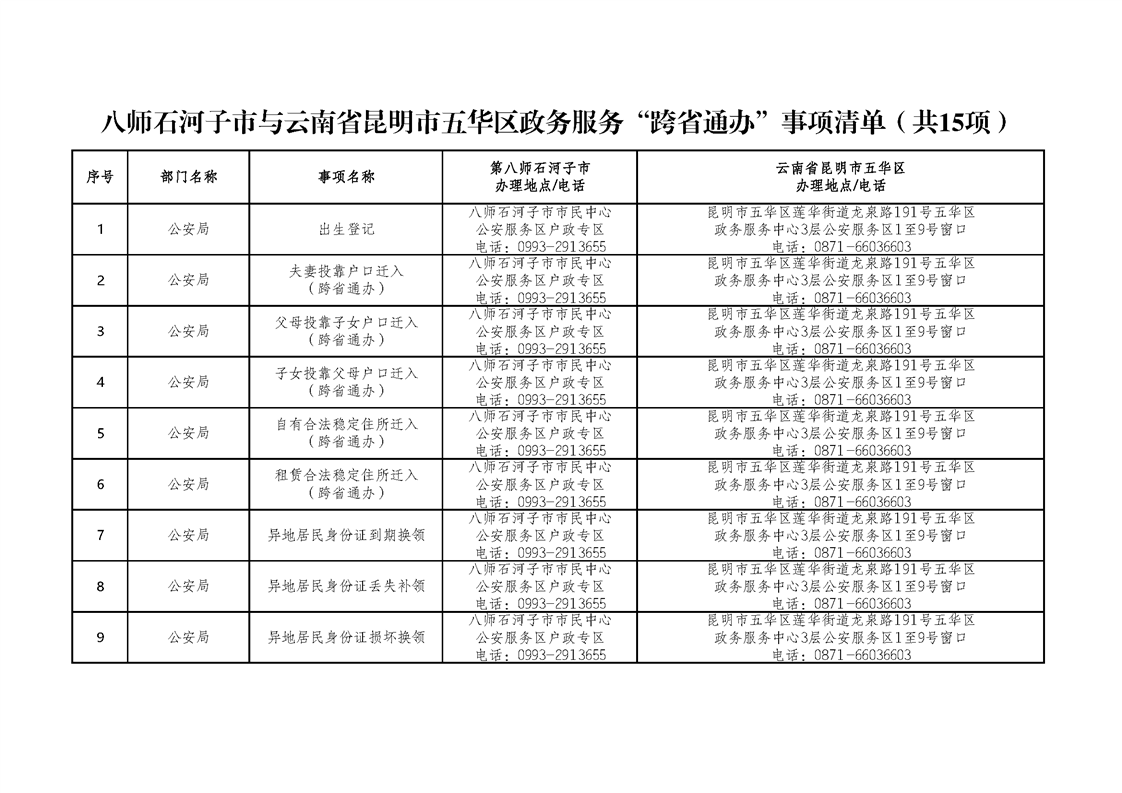 八师石河子市与云南省昆明市五华区“跨省通办”事项清单(共15项)